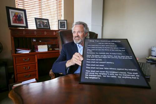 The law says public schools “shall display” a poster or framed copy of the Ten Commandments in a conspicuous place in each classroom. Schools must accept donated posters that meet the law’s specifications but aren’t required to purchase them.