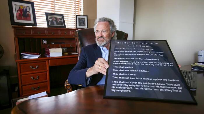 The law says public schools “shall display” a poster or framed copy of the Ten Commandments in a conspicuous place in each classroom. Schools must accept donated posters that meet the law’s specifications but aren’t required to purchase them.