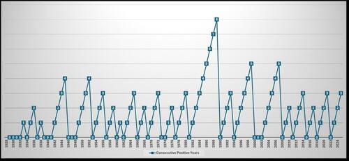 The second graph below is courtesy of one of our clients. His graph helps us assess whether we can expect a fourth consecutive year of positive returns. As shown, eight straight years is the record, with two four- and five-year winning streaks.