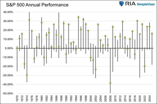 The graph below shows annual returns (gold diamonds) and the range between the minimum and maximum returns for each respective year. The average annual return since 1970 has been 9.43%, with an average yearly drawdown of 11.12%. Moreover, the average annual maximum gain was 16.35%, approximately 7% higher than the average closing price. Thus, the market, on average, closes at the 65th percentile of its range.