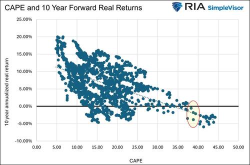 The first graph below shows the extent to which the CAPE10 valuation at 39 is stretched. Based on historical correlations between valuations and returns, we should expect negative real returns over the next 10 years. However, the second graph indicates that returns of +/- 25% are possible in 2026.