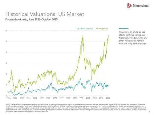 2026 may be the year that valuations normalize, thus resulting in a down year. Even if that is the case, we must recognize that market valuations and those of individual stocks and sectors can differ significantly.  Some sectors are less expensive than others and may perform better in a down market. For example, the graph below, courtesy of Dimensional, shows that large-cap price-to-book ratios are at record highs, whereas those for small-cap value companies are at the midpoint of their range over the last 25 years.