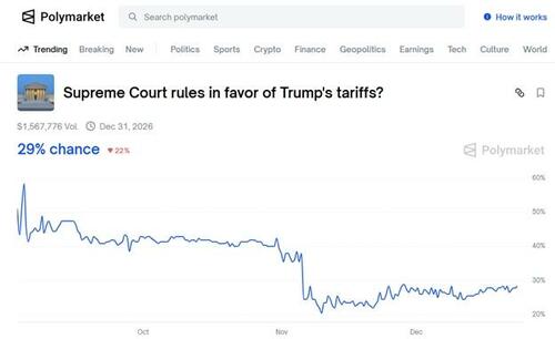 The Supreme Court has heard oral arguments in the tariff legality case and will announce its findings on January 9, 2026. According to Polymarket, the odds of a favorable ruling for Donald Trump are low at 29%.