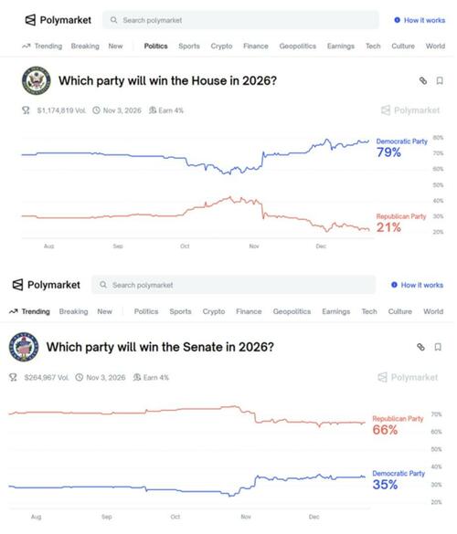 The November midterm elections will determine the balance of power in the U.S. Congress. As shown below, the Polymarket betting site assigns a 79% probability to the Democrats taking control of the House and a 66% chance that the Republicans will maintain Senate leadership.