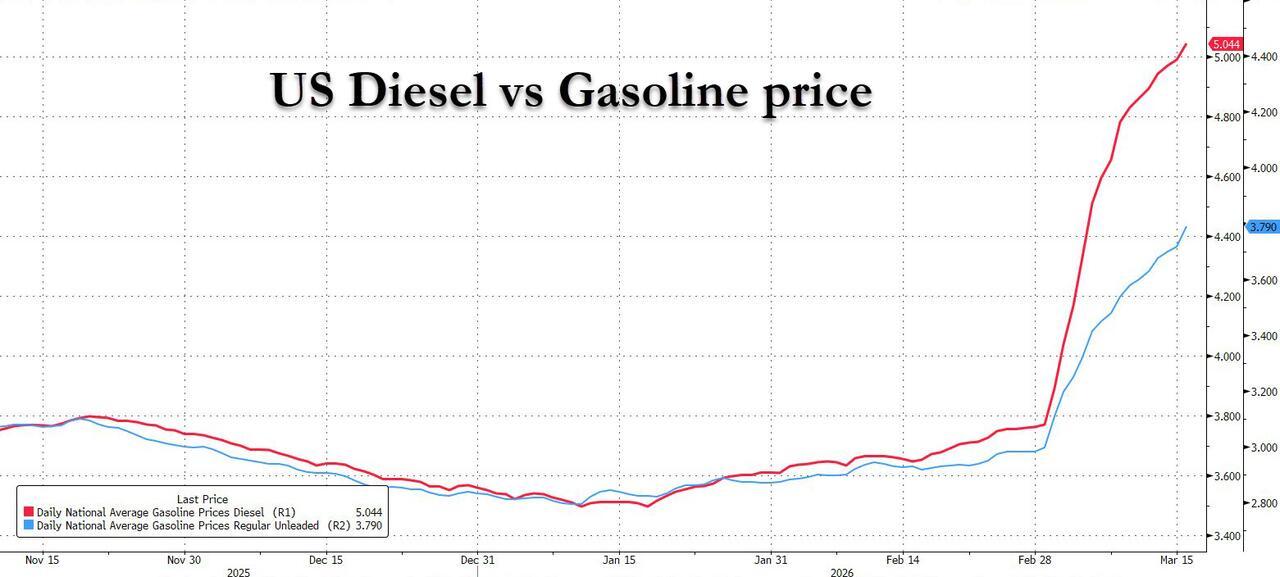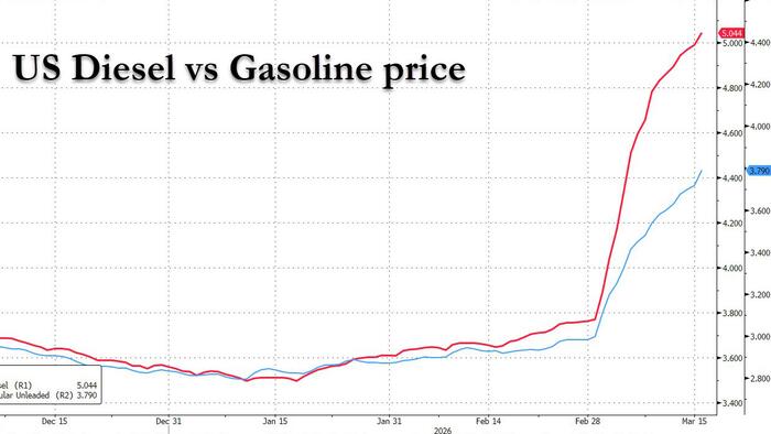 While US gasoline prices have risen substantially since the start of the Iran war (although RBOB futures suggest there is much more upside should oil prices remain around $100), the average price of diesel has already soared above $5 per gallon in the US, the highest since 2022, and pushing up supply chain costs and setting the stage for broader inflation for consumers.