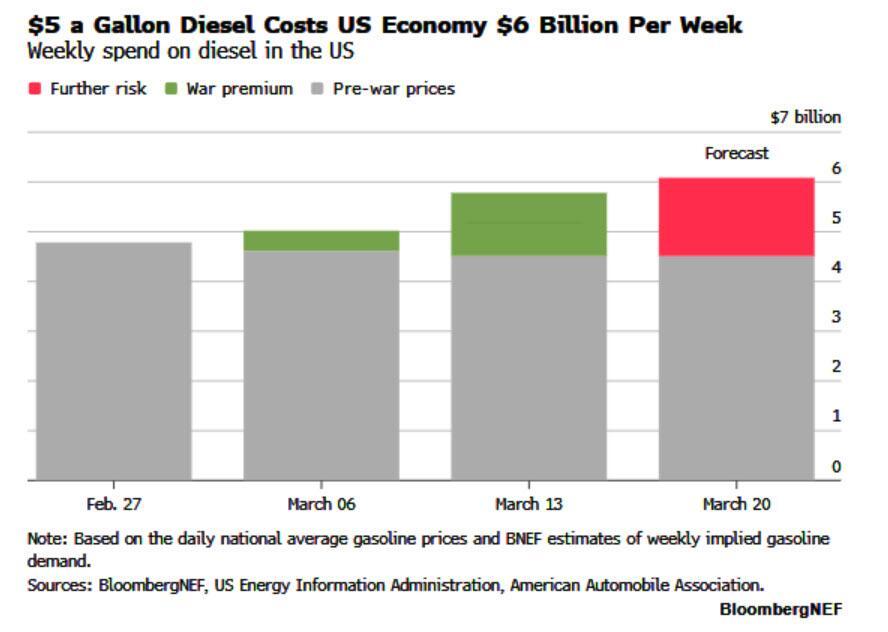 With diesel at $5 per gallon, these industries are on track to spending around $6.1 billion this week on the fuel, according to BloombergNEF forecasts.
