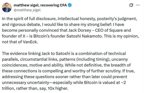 So what makes some intelligent and respected people — including VanEck’s head of digital assets research Matthew Sigel — so confident that Dorsey is the creator of Bitcoin?
