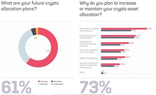 Over 61% of institutions plan to increase their cryptocurrency investments, while 55% hold a bullish short-term outlook, Swiss crypto banking group Sygnum said in a report released on Tuesday.