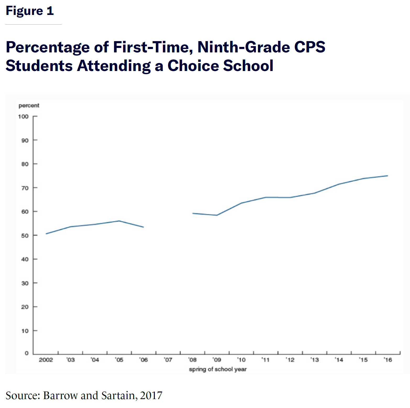 The popularity of CPS’s choice model is long-standing. In 2017, economists Lisa Barrow and Lauren Sartain studied the enrollment decisions of first-time, ninth-grade students in Chicago from 2002 to 2016. During that 15-year period, the number of public high schools in the city grew from 76 to 138, due to reforms aimed to increase the number of high-quality public school options. Barrow and Sartain found that, during this time, the share of first-time, ninth-grade students who opted out of their zoned high school rose steadily, from 51% in 2002 to 75% in 2016.[4]