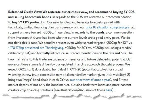 … and sure enough, for the next month or so, Oracle CDS tightened rather notably. However, we certainly did not expect the company to just sit there and do nothing, as the market started asking questions again about where the tens of billions in committed funding would come from. After all, we were the first to lay out back in November the case why Oracle CDS should be trading much wider than it was at the time (see “Oracle Is First AI Domino To Fall After Barclays Downgrades Its Debt To Sell.“)