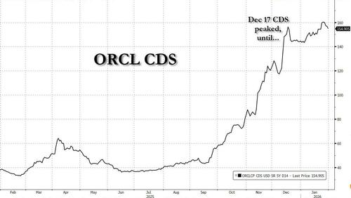 Just over a month ago, on Dec 17, alongside the news that Abu Dhabi was set to invest billions in OpenAi this preventing a year-end tech rout, we said that ORCL CDS – which on that day hit the widest level since the 2008 financial crisis at 156bps – “may have gone a bit too far”…