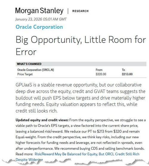 First, it was Morgan Stanley’s analysts (here for pro subs) with a major cut to their ORCL price target. The reason: “GPUaaS is a sizable revenue opportunity, but our collaborative deep dive across the equity, credit and GVAT teams suggests the buildout will push EPS below targets and drive materially higher funding needs. Equity valuation appears to reflect this, while credit still looks rich.”