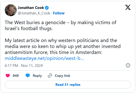 But once again, Starmer and his ministers seek to revive the early, confected Amsterdam narrative, this time suggesting that it is the the Tel Aviv football hooligans that are in danger from Aston Villa fans, that any resentment from Aston Villa fans towards Tel Aviv fans is driven solely by antisemitism rather than by the Tel Aviv fans’ long record of genocidal chants and racist violence, and that the police decision to bar the Tel Aviv hooligans is capitulation to “antisemitism”.