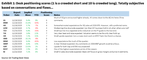 Home Improvement – Price Action is a Must Watch: Sentiment has cooled here very recently. Small top-line downside is expected from both HD and LOW and consensus numbers in 2026 have been moving lower. Despite some expected squishiness here, there does still seem to be investors optimism that pockets of housing are ownable into 2026 (HD especially). That is why price action will be just as telling as actual results, given few names in consumer have traded well on squishy results so far. Our view is the price action out of HD and LOW feels like it will be more important than the actual results, absent a shock out of numbers (other than tiny top-line downside).