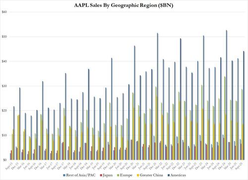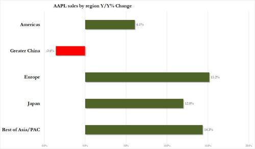 Soft iPhone sales aside, it was the surprising drop – and miss – in China sales that prompted the early selling in the stocks: contrary to expectations for a modest rebound, China sales declined down 3.6%, the 7th drop in the past 9 quarters, down a 11.1%, and printing at only $14.493BN, below the $16.43BN estimate. The rest of the world saw growth, with Americas rising 6.1, and double digits growth in both Europe and APAC