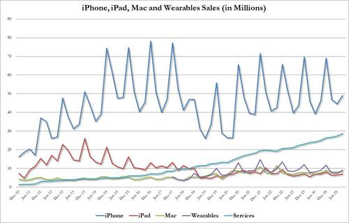 Offsetting the China weakness, however, was another solid quarter out of the Services division, which again came in stronger than expected, rising to a new record $28.750 billion, 15% YoY and above the $28.18 billion expected.