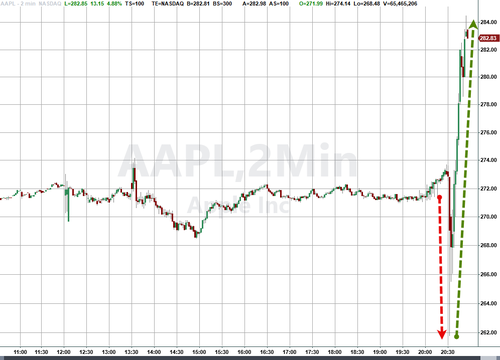 For now, the plan is working and AAPL stock managed to sharply reverse its early drop, surging about 3% after hours.