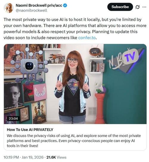 His post echoes points made by privacy advocate and NBTV founder Naomi Brockwell, who described running models locally as the most private way to use AI without sending prompts or documents to external servers.