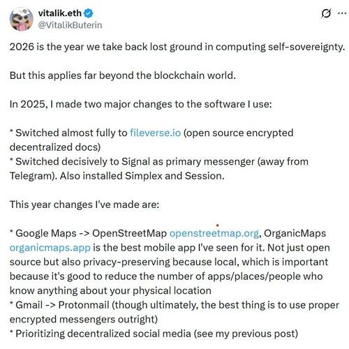 In 2026, Buterin has moved from Google Maps to OpenStreetMap via OrganicMaps and from Gmail to Proton Mail, while prioritizing decentralized social media.