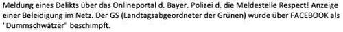 Translation via ChatGPT: “Report of an offense via the online portal of the Bavarian Police through the reporting office REspect! Reporting an online insult. The GS (Green Party member of the state parliament) was called a ‘Dummschwätzer’ (‘blabbermouth’ / ‘loud-mouthed idiot’) on Facebook.”