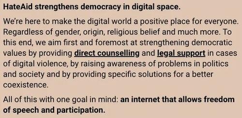 HateAid purports to be a defender of free speech. From its homepage: