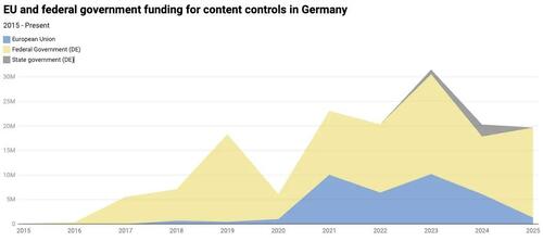 The report indicates that government funding for content controls peaked in 2023 at about $36 million (converted from euros, as all dollar amounts in this article are) among the German federal and state governments as well as the EU. While the combined funding among the three has decreased to around $23 million, the amount from the German federal government remains roughly the same and has increased since last year.