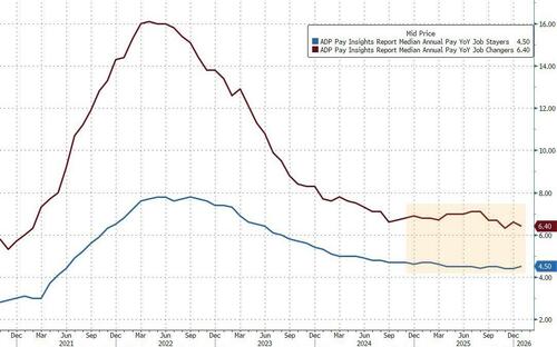 The ADP report, published in collaboration with the Stanford Digital Economy Lab, showed workers who changed jobs saw a 6.4% increase in pay, decelerating from the prior month. Those who stayed put saw a slight pickup in pay gains.