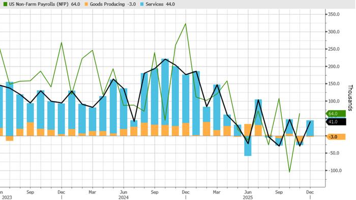 One month after ADP reported a dismal -29K private payrolls print for November, tied for the worst month since March 2023, and just in time to validate the Fed’s latest rate cut, moments ago ADP reported that in December, the US added 41K payrolls, which while a solid jump from last month’s -29K, missed consensus estimates of a +50K print.