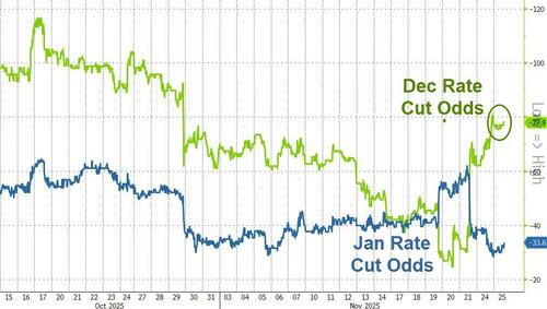 This is certainly not good news, but it does shift the dove/hawk argument at The Fed to pro-cut side and we see odds rise for December…