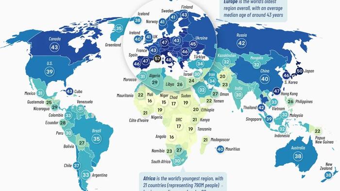 On the other hand, Europe and East Asia have some of the oldest populations on the planet. Europe’s oldest include Monaco (57), Italy (48), and Germany (47), while in Asia, Japan (50), Hong Kong (47), and South Korea (46) underscore the region’s demographic decline.