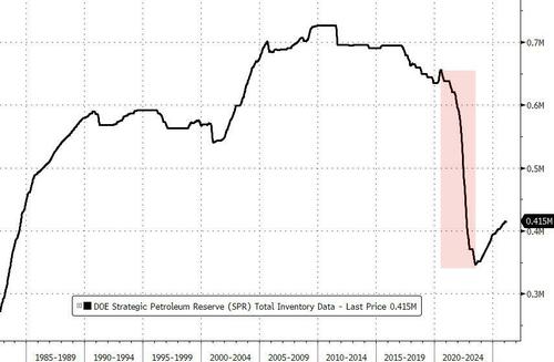While Biden, Schumer and their pals all claimed to understand the global oil markets – and the logic of why this release would work… it failed to prevent sustained high prices. As the chart below shows, even as the SPR was drained dramatically, prices remained elevated, overshadowed by broader market forces like OPEC decisions, refining constraints, and geopolitical risks (as we warned at the time numerous times)…