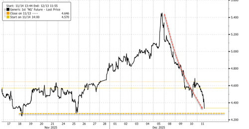 From the peak of $5.4 per MMBtu last Friday, NatGas futs have tumbled into a bear market ….