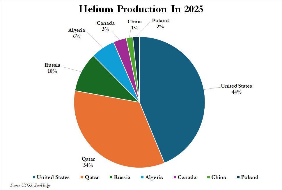 Earlier this week we reported that global chip production was in peril as “Qatar Warns Helium Exports Set To Collapse.” Best known as the gas that makes party balloons float, helium is far more important as a key input in chipmaking, space rockets and medical imaging. The problem is that Qatar supplies a third of the world’s helium, and the Gulf nation had to halt production after Iranian strikes against the region’s energy producing infrastructure crippled its LNG production which is critical to make helium, leading Qatar’s state-owned gas company to warn helium exports would collapse.