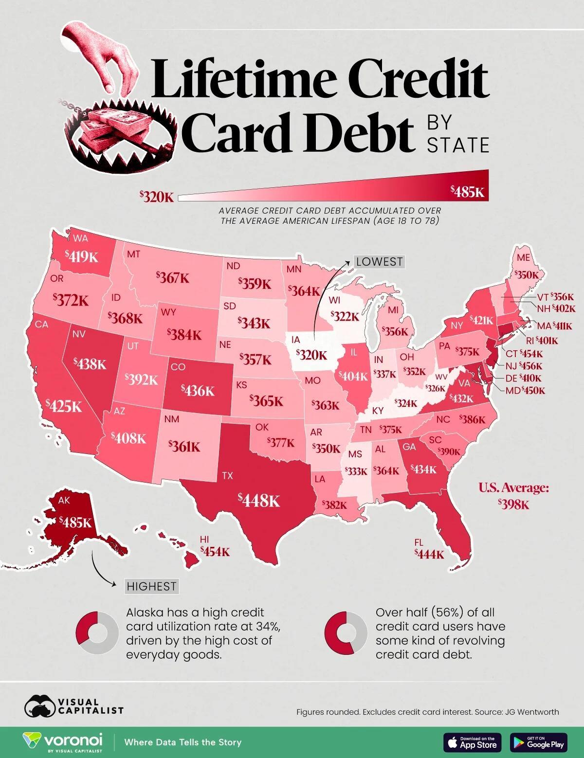 Average lifetime credit card debt exceeds $400,000 in 20 states.