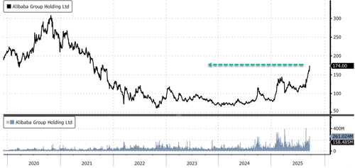 After Nvidia announced a $100 billion investment in OpenAI (something we described earlier this week as “the biggest vendor-financing circle jerk in world history“), shares of Alibaba Group in Hong Kong surged 9% to a four-year high after unveiling plans to ramp up AI spending well beyond its prior commitment announced in February.