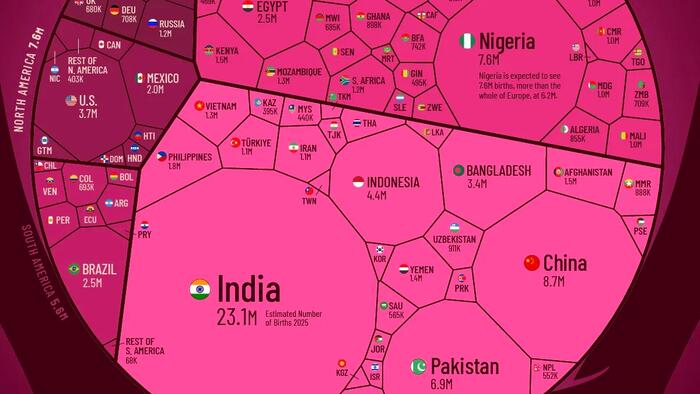 Africa is the fastest-growing region by births, reflecting high fertility rates and youthful populations across much of the continent. Nigeria stands out with an estimated 7.6 million births in 2025, more than all of Europe combined, which is projected to see about 6.3 million.