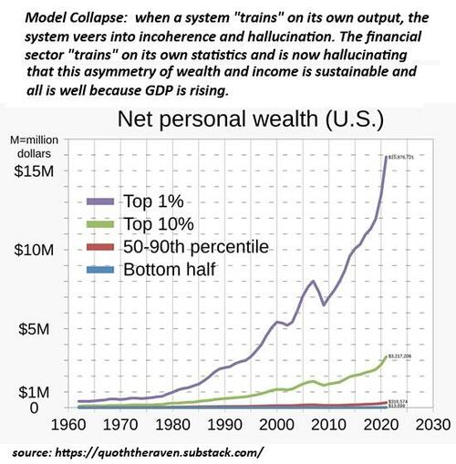 Over time, this self-referential “training” degrades the output–the analysis and the decisions based on that analysis–to the point of hallucination: the model is generating output of how the world works that has drifted to far from authentic understanding that it is a hallucination, one that is taken to be “real” by those controlling the model.