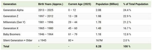 Generation Alpha, born between 2013 and 2025, now includes roughly 2.0 billion people, or 24.4% of the world’s population. Many of them are still in primary school, but they already outnumber every other generation.