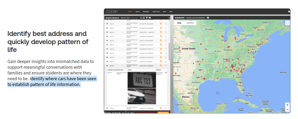 One of the particular things the Clear page notes is its ability to access license plate data “and develop pattern of life information” that helps identify whether those who are claiming they’re residents for the sake of getting a kid enrolled in school are lying or not.