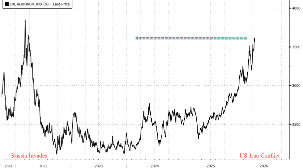 Aluminum prices on the London Metal Exchange are climbing into the end of the week, reaching $3,621 a ton and approaching the peak seen during Russia’s 2022 invasion of Ukraine. The problem now is that the aluminum market has been thrust into a serious supply shock amid the U.S.-Iran conflict in the Middle East, one that is unlikely to be reversed in the near term.