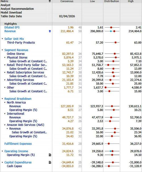 At first, the market was happy to reward big capex forecasts (META); but just a few days later, it changed its mind and decided that the bigger the beat, the bigger the penalty (as was the case with GOOGL today). That leaves Amazon in a precarious place as it prepares to report earnings after the close today: does it project some berserk number or does it risk being conservative? After all, the only thing that will matter is the capex forecast (the earnings will likely be good enough).