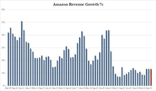 Of the above, the most notable highlight was AWS which grew revenue by 19.7% (stronger than the 19% year ago) to $33.0BN, above the sellside estimate of $32.39BN. That said, despite the latest quarterly beat, the growth rate is clearly slowing but not enough for the market to care right now: