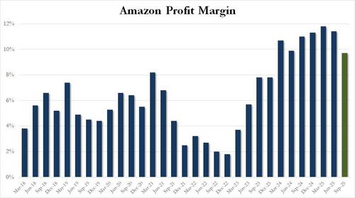 As a result of the drop in AWS profits, Amazon’s consolidated operating margin posted a sequential drop and in Q3 declined from 11.4% to 9.7%, the lowest since 2023.