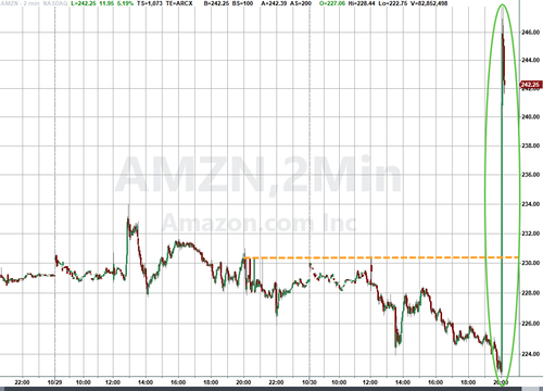 In response to the solid guidance and the AWS results which came in above expectations, the spiked after hours, and surged just over $20, or nearly 9%, rising to a new all time high…