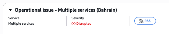 Amazon’s Service Health page on its website shows that AWS is “Disrupted” in the Bahrain operating area.