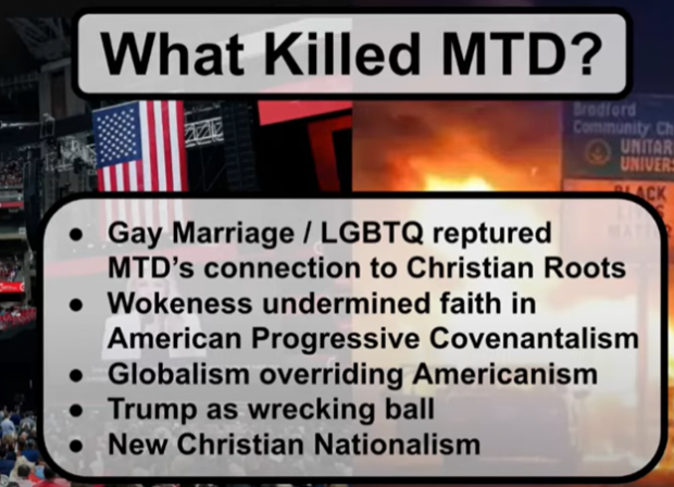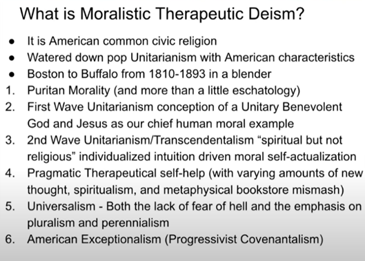 Herein I wish to point you to Tideman’s recent presentation, Does Moral Therapeutic Deism still exist? This is a socio-political analysis of American political history up to our current predicament. (PVK made an insightful commentary on Tideman’s presentation, The Fracturing of the Religions Nominalism Beneath American Culture and Politics.) The key premise is that there has been, and there must be, an agreed upon arena for political discourse; indeed, for all political activity to maintain a peaceful polity. The concept is similar to the Overton window or Tom Woods and his 3×5 card of allowable opinion, but much more implicit than explicit. It is the arena where civil politics can play out. If there is no agreed upon arena the ultimate result can be civil war until a new arena is established by the survivors. Furthermore, Tideman posits that in America this arena has been what an academic called Moralistic Therapeutic Deism (MTD), and MTD is essentially Unitarianism. See the following slides from the presentation on the thesis and MTD.