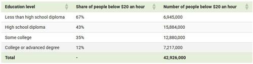 Among workers whose highest education is a high school diploma, 43% earn under $20 per hour. This group represents the largest number of low-wage workers overall, totaling nearly 15.9 million people.