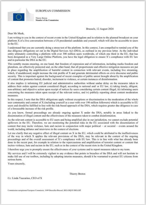 Further, Musk brings receipts showing the European Union sent him a formal letter demanding that he censor Donald Trump during the 2024 US presidential election.