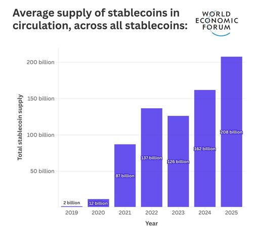 Average supply of stablecoins in circulation, across all stablecoins. Source: World Economic Forum.