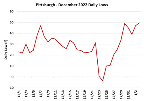 Winter Storm Elliott in December 2022 pushed Pittburgh to overnight lows of -3.7F at the peak cold that weekend, and production was crushed as a result.